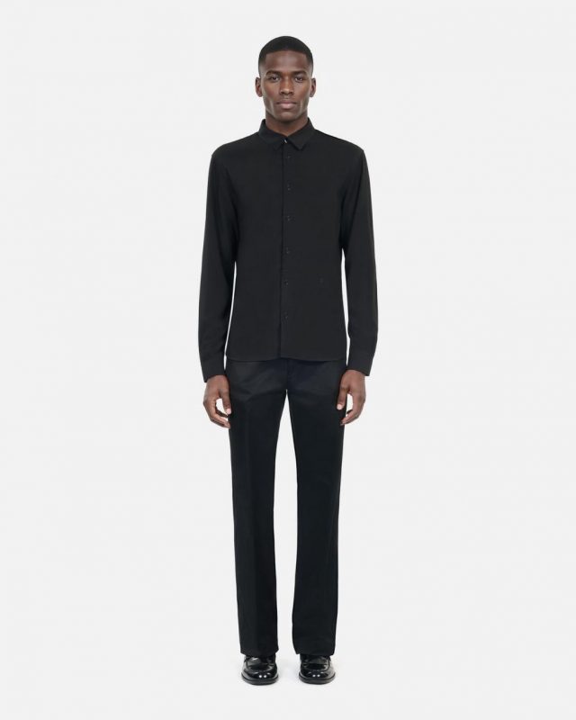 Le mannequin mesure 191 cm et porte le produit en tailleM. Référence : HCCL28085KBLA01 Cette chemise noire fluide à la coupe droite se distingue par sa broderie TK délicatement positionnée à l’avant. Son col classique et ses poignets avec rivet ajoutent une touche de modernité. Parfaite pour un style élégant et contemporain. Coupe droite Col classique Poignets avec rivet Broderie TK devant Patte de boutonnage américaine Associez-la à un pantalon en cuir pour un look audacieux ou à un jean pour une tenue plus décontractée.