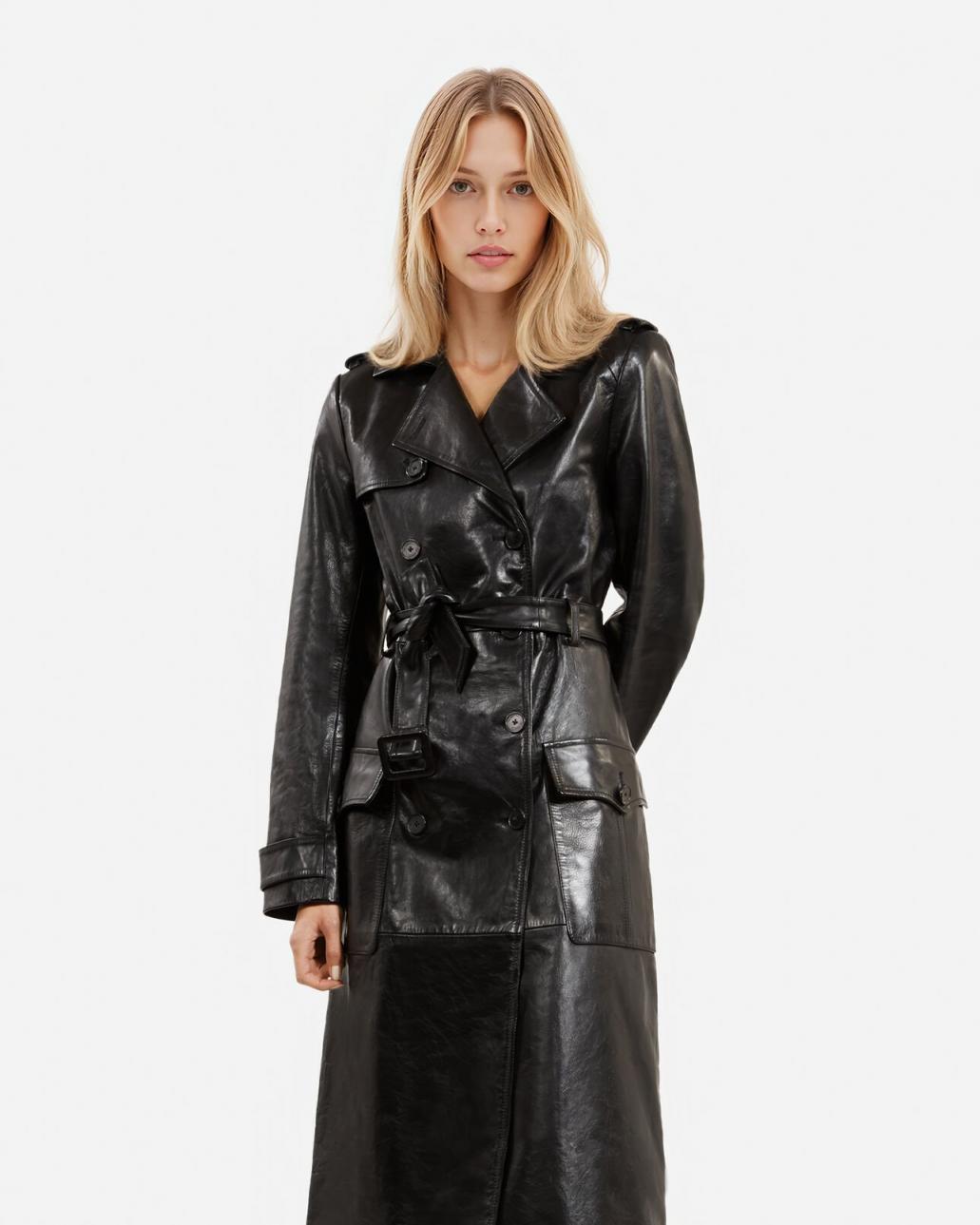 Le mannequin mesure 177 cm et porte le produit en taille1. Référence : FCUI30006KBLA01 Trench femme The Kooples en cuir Cuir lisse Pattes d’épaule Manches longues Poignets ceinturés Fermeture double boutonnage Poches plaquées à rabat Ceinture amovible