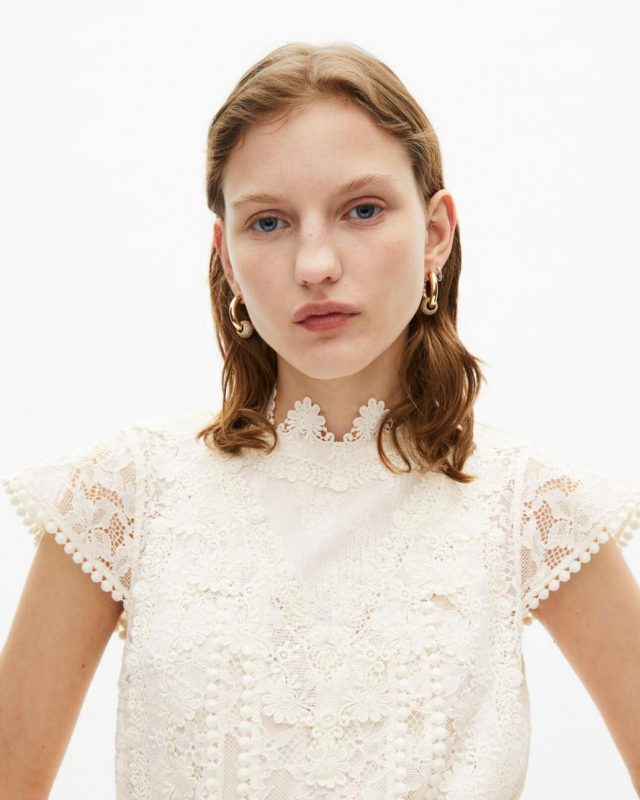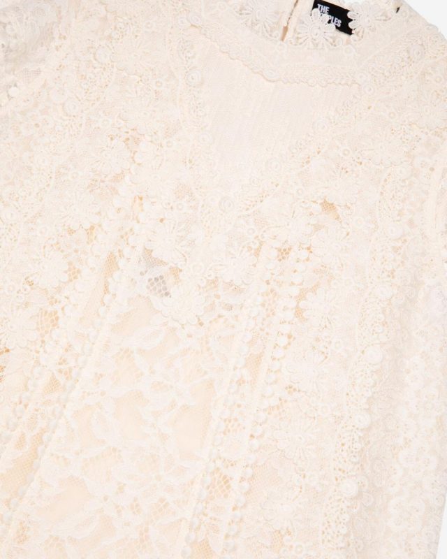 Le mannequin mesure 176 cm et porte le produit en taille1. Référence : FROB30096KECR01 Robe femme The Kooples en dentelle Robe évasée Col montant en dentelle Sans manches Détails de volants et empiècements dentelle Longueur 89,5cm pour une taille 36
