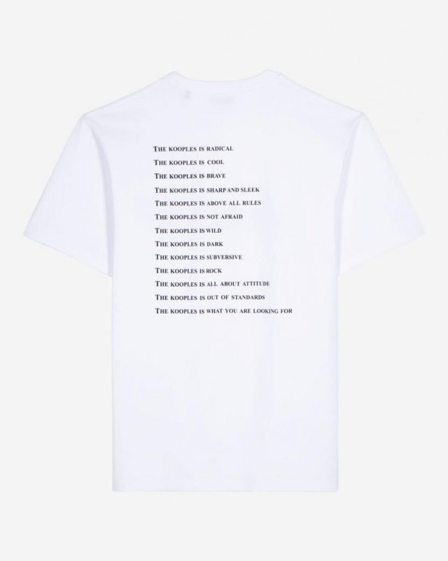 Le mannequin mesure 188 cm et porte le produit en tailleM. Référence : HTSC30049KWHI01 T-shirt homme The Kooples Coupe droite Col rond Manches courtes Sérigraphie patch denim devant Sérigraphie dos